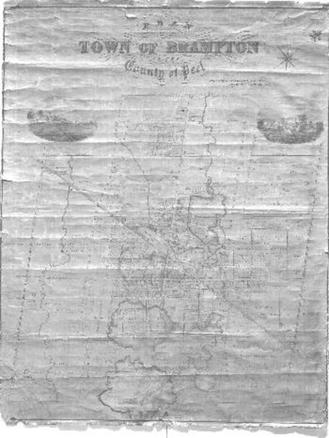 This rare map, acquired in 1999 by the Brampton Historical Society, is the earliest known map of Brampton in existence. Because of the historic significance of this document, the Brampton Historical Society received a grant to pay for its restoration. Due to its fragile condition, the original, restored map is on display at the environmentally controlled Museum at the Peel Art Gallery, Museum + Archives
